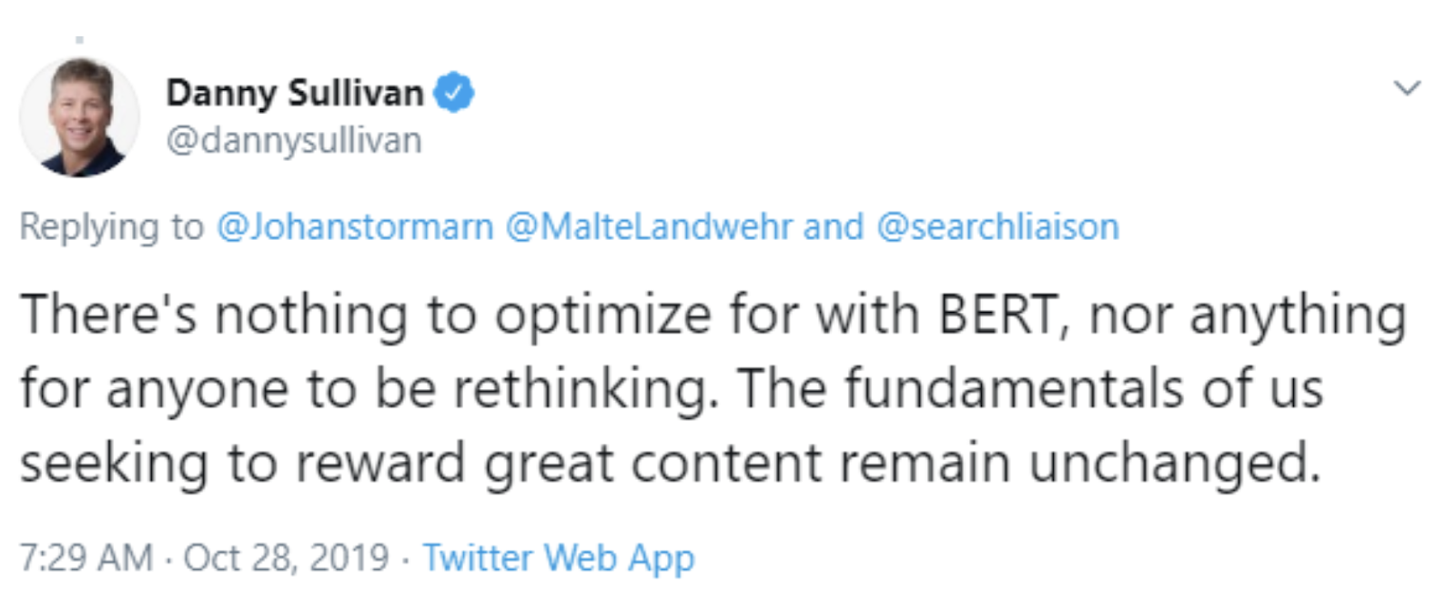 Danny Sullivan from Google mentioned that content marketers and SEO professionals wouldn’t have to do anything — except creating great content — to optimise their web pages for Google BERT.
