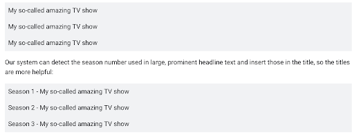 The micro-boilerplate title elements appear on the season pages. The titles omit the season numbers, so it’s not clear which page is for what season.”