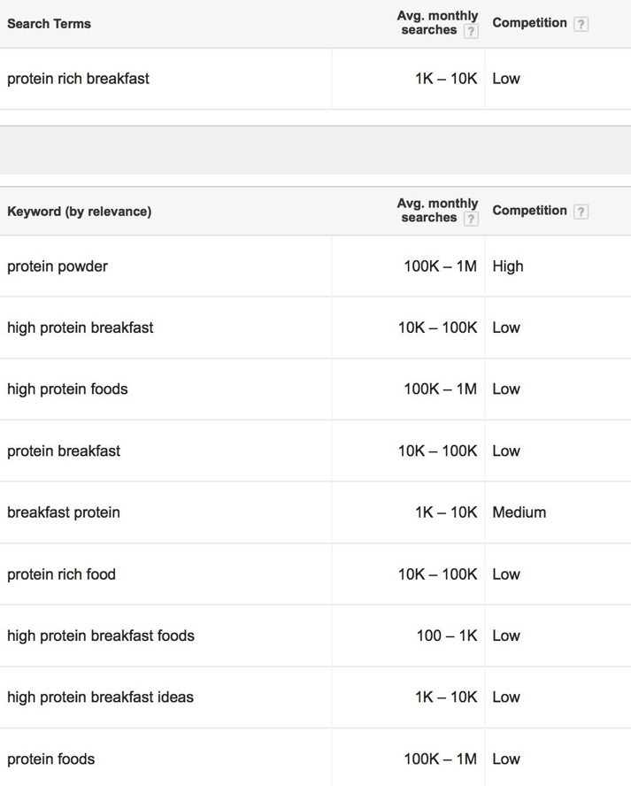 Let’s continue our example for the keyword ‘protein rich breakfast’. If we get new keyword ideas (by using the first feature of Google Keyword Planner), this is what the ‘keyword idea’ list shows.